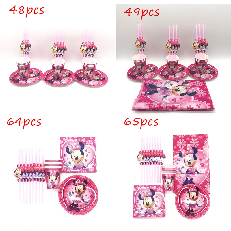 65 шт./лот Розовый Минни Маус мультфильм день рождения украшения тарелка скатерть бумажный стаканчик салфетка Гибкая соломка набор посуды