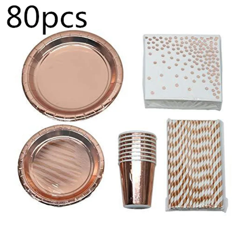 Новинка, 80 шт./компл., чашки из розового золота, пластиковые тарелки, вилки, ножи, ложки, одноразовые, чистая посуда, набор, принадлежности для вечеринок