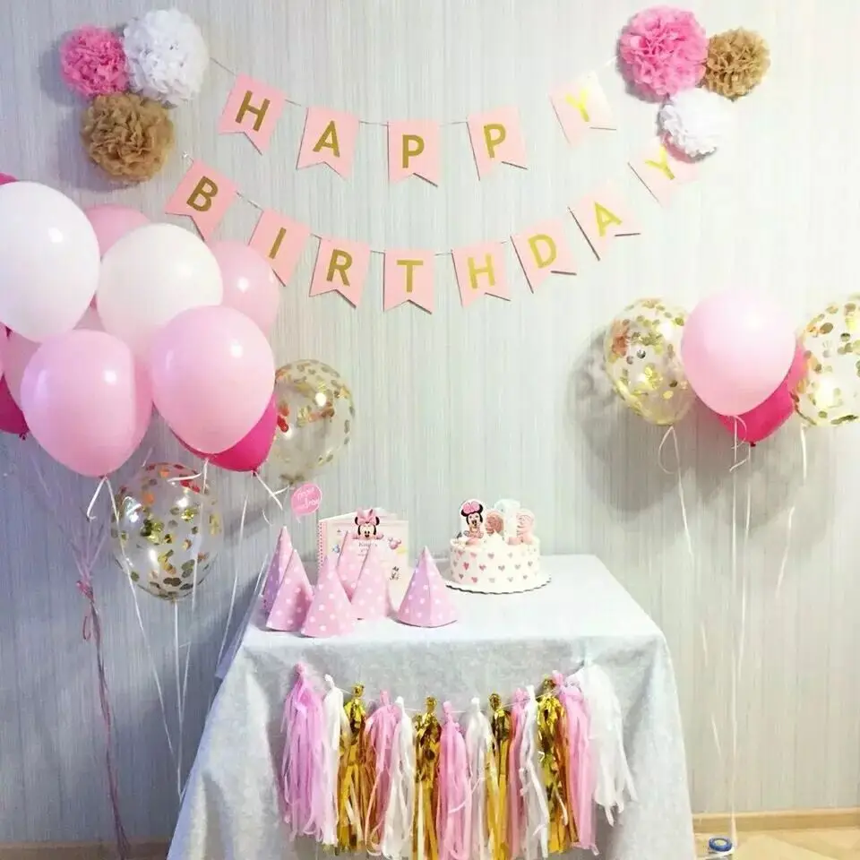 Розовый с днем рождения баннер шары с золотыми конфетти баннер с надписью Baby Shower День рождения украшения для мальчиков и девочек Детские вечерние сувениры