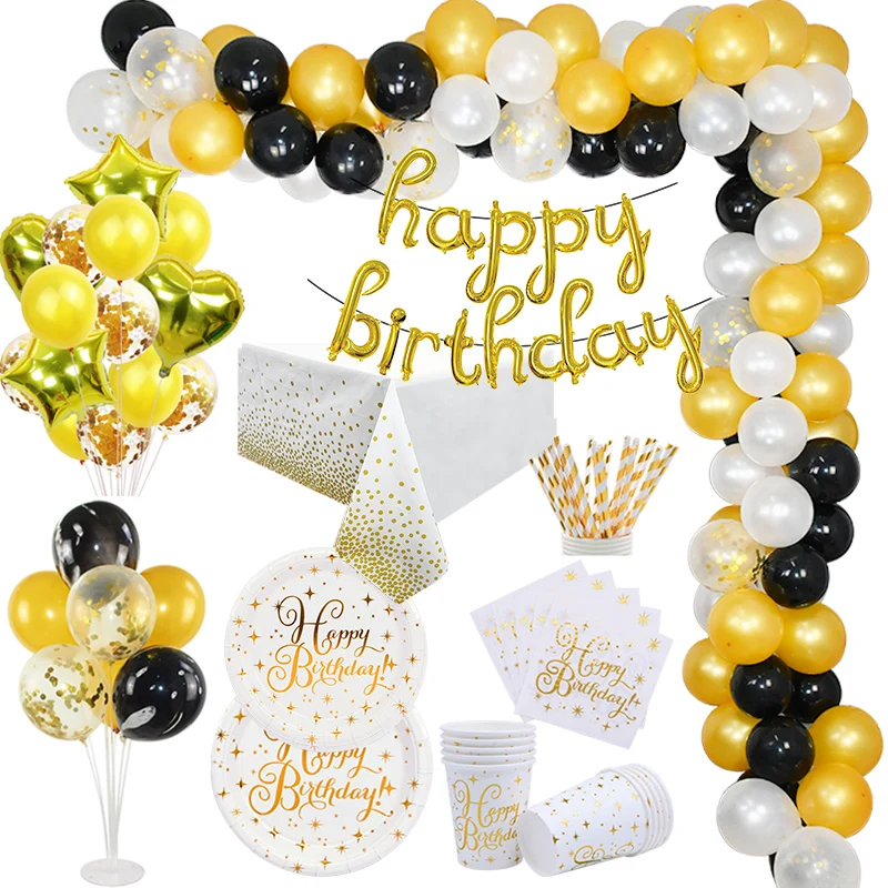Золотые одноразовые столовые приборы для вечеринки, бумажные стаканчики и тарелки, соломинки, баннеры, латексные шары, украшения для дня рождения, вечеринки, Товары для детей