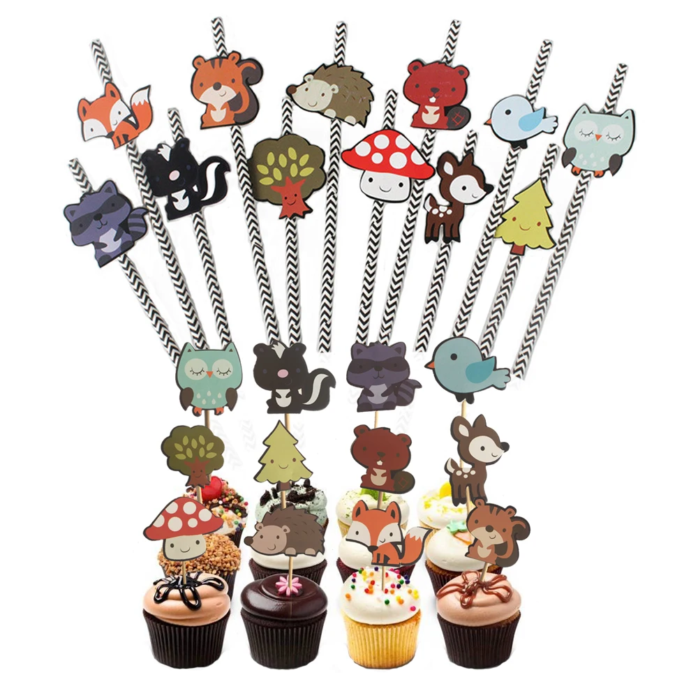 24 шт лесные животные тема Торт Топперы 12 шт животные друзья бумажная Солома для детского душа Дети День рождения украшения сувениры