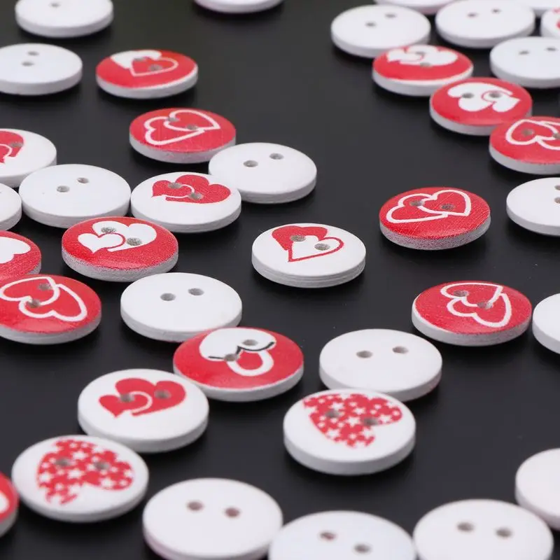 100 шт Деревянные красные и белые деревянные пуговицы с сердечками для скрапбукинга, украшения для рукоделия, вечерние украшения для дома