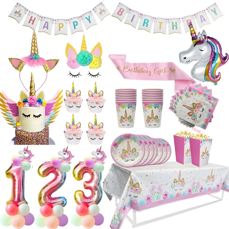 Девичьи вечерние принадлежности в виде единорога, бумажная тарелка в виде единорога, чашка для дня рождения, декорации вечеринок, для детей,...