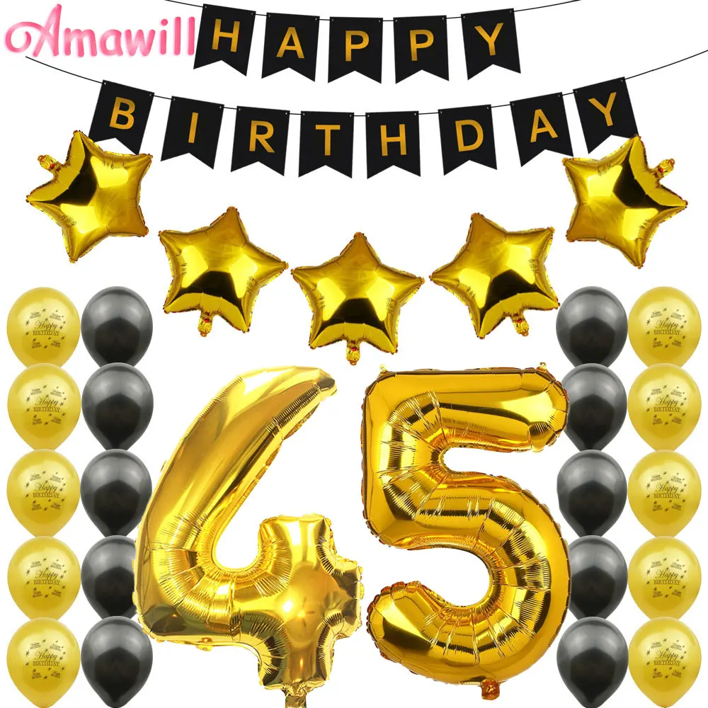 Amawill 45th День рождения украшения комплект 12 дюймов золотистый и черный шар с днем рождения баннер для взрослых 45 лет вечеринок 7f