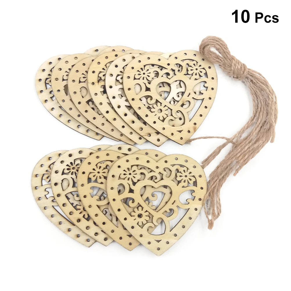 80 мм 10 шт рождественские деревянные чипы, незавершенные Висячие фестивали, экологические сердечки, полые деревянные ломтики с 10 пеньковыми веревками