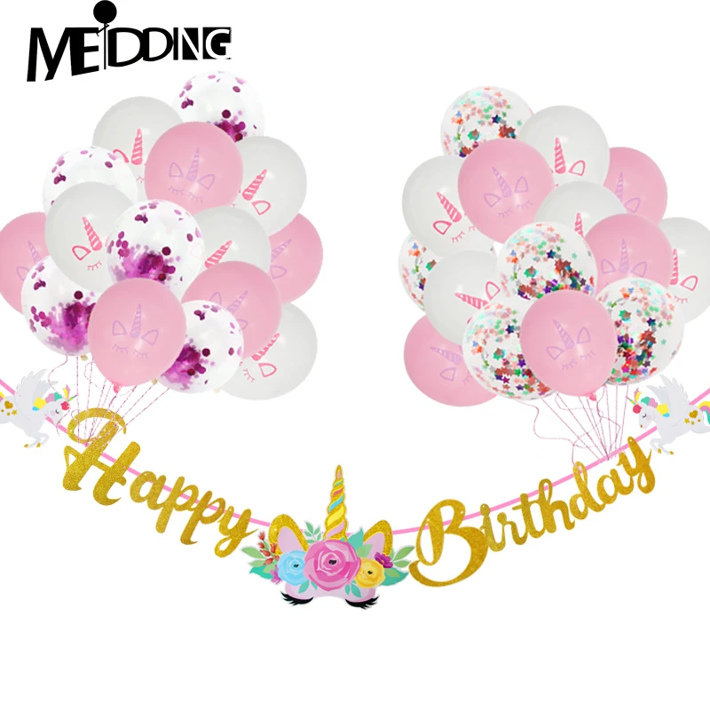 31 шт./лот 12 дюймов воздушные шары в форме единорога счастливый плакат "с днем рождения" Конфетти баллон латексный воздушный шар для Бэйби Шау...