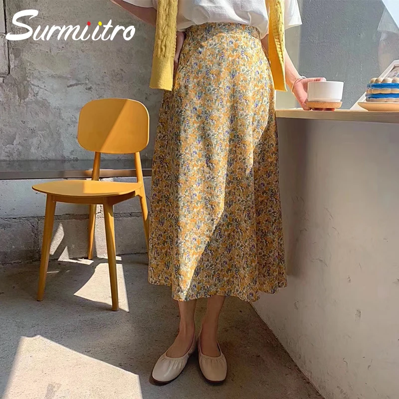 женская юбка-миди SURMIITRO, желто-фиолетовые цвета, длинная юбка с цветочным принтом и высокой талией в корейском стиле для женщин