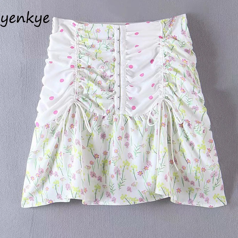 Милая драпированная мини-юбка с цветочным принтом и завязками, Женская юбка с боковой молнией, высокая талия, трапециевидная юбка в стиле бохо, летняя шифоновая юбка jupe femme YF7456