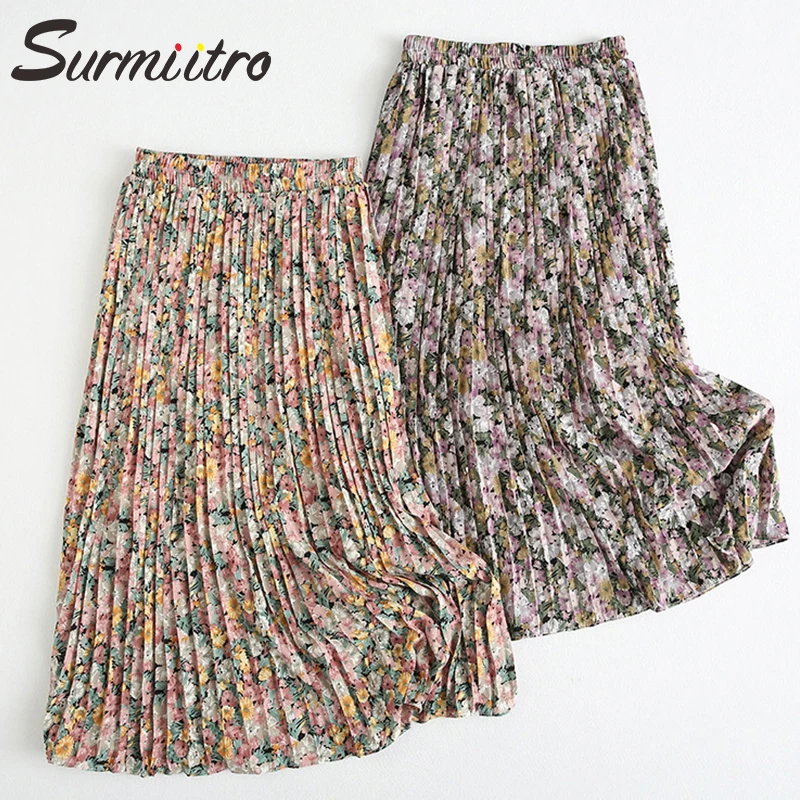 женская длинная юбка с цветочным принтом SURMIITRO, белый черный цвет шифон плиссированная макси юбка для женщин с высокой талией в корейском стиле для женщин весна-лето