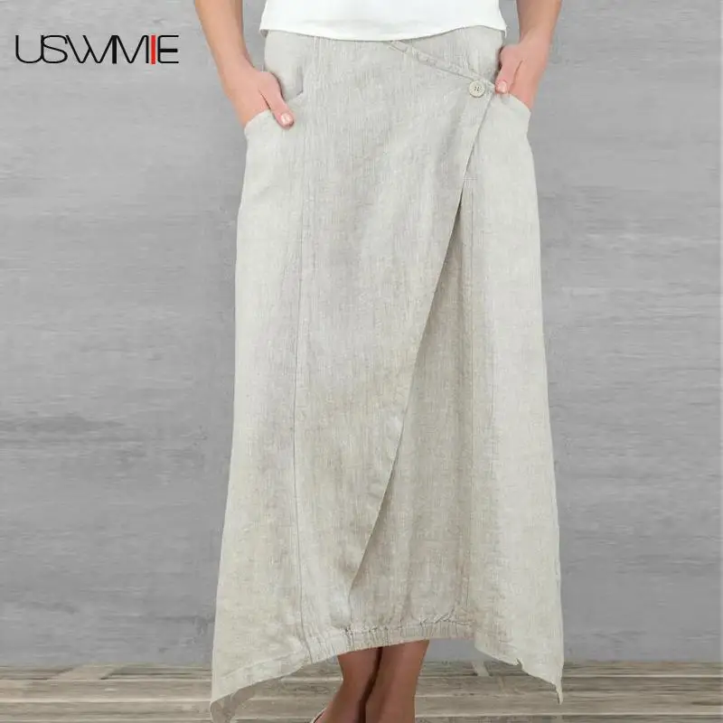 Женские юбки 2019 литературная льняная повседневная юбка с высокой талией и карманами, одноцветная юбка с эластичной резинкой на талии для от...