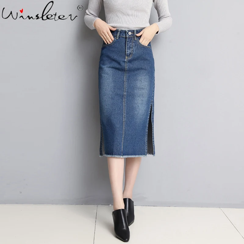 Винтажная юбка миди, джинсовые джинсы, консервативный стиль, футболка, юбка с высокой талией, Боковым Разрезом, до середины икры, летняя одежда для женщин, женская, B02916B