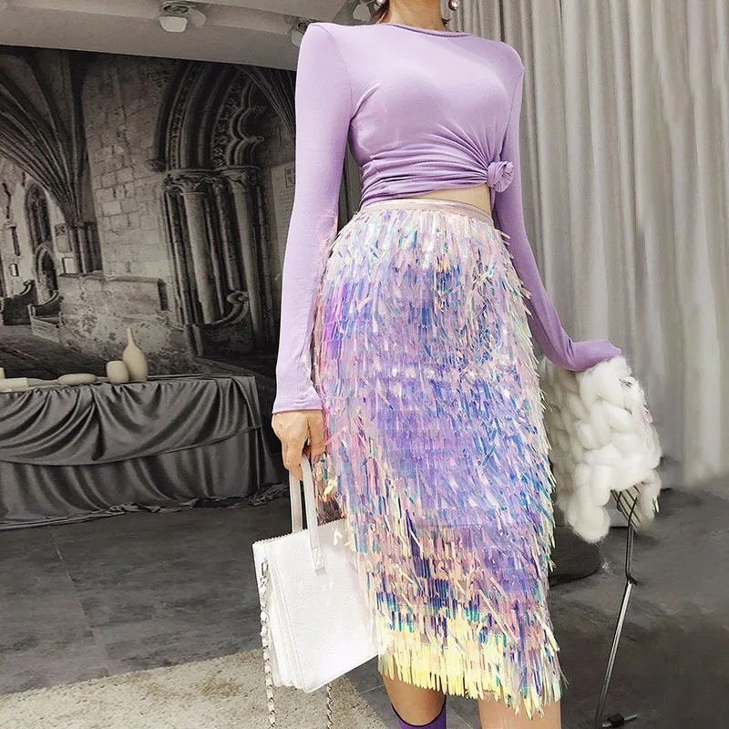 LANMREM 2019 Весенняя мода новая Эластичная Высокая талия с блестками кисточка Универсальная Женская сетчатая юбка YE588