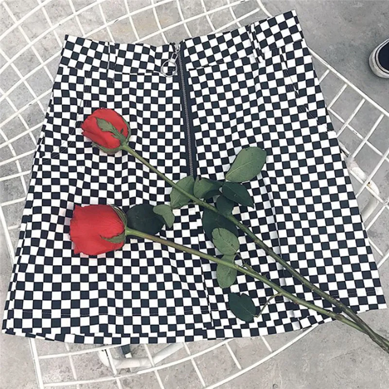 2018 Новая повседневная Летняя женская японская стильная молния кольцо А-силуэта с высокой талией Мини-юбка женская черная белая клетчатая ю...