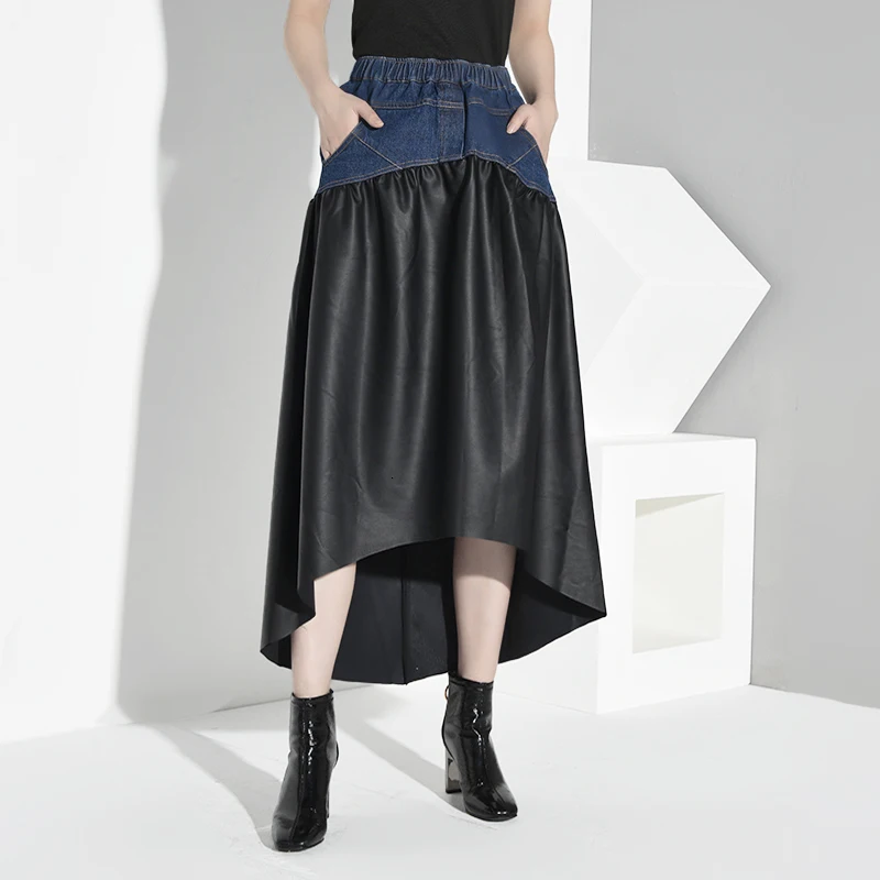 [LANMREM] 2019 Новинка Весна Лето Высокий Эластичный Талия черный полубоди юбка женская Мода Tide PU Лоскутная джинсовая JO27301