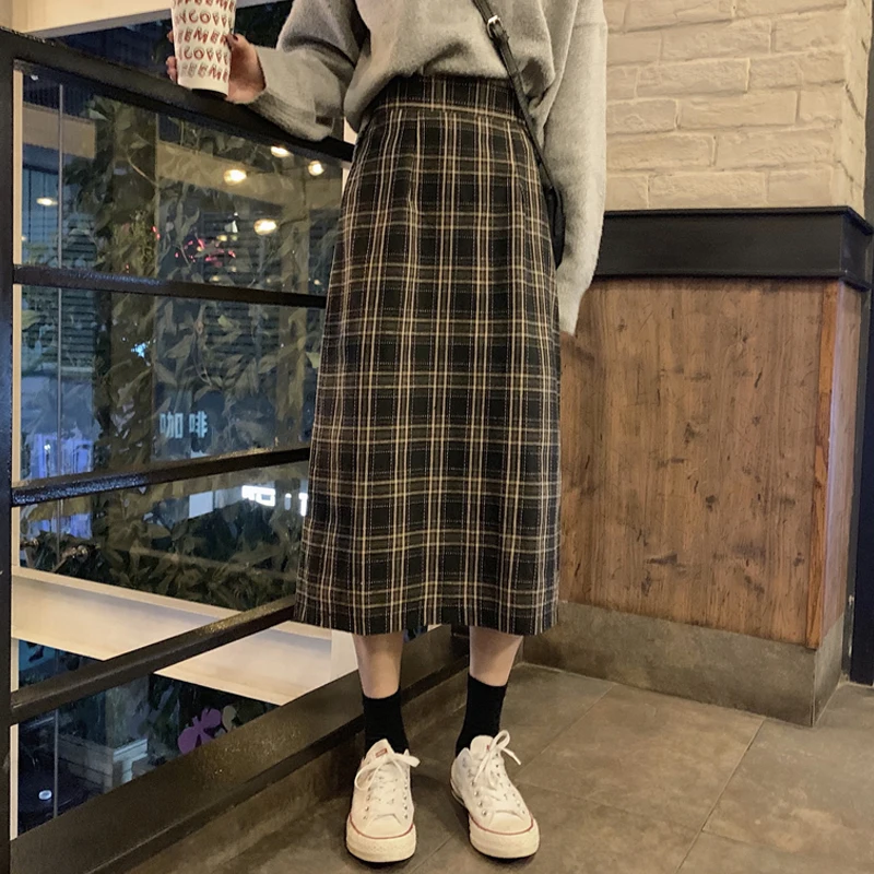 Боковое разрезное клетчатое гофрированные длинные юбки с высокой талией, зимняя женская Корейская шерстяная юбка, уличная юбка миди с элас...