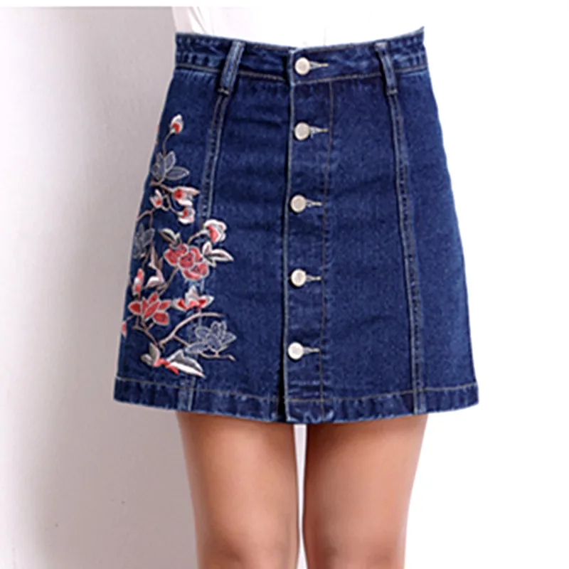 2019 женские стильные вышитые цветы на джинсовой ткани пуговицы для юбки faldas mujer Европейский стиль женские модные трапециевидные юбки
