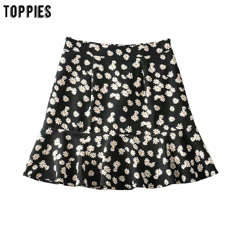 Toppies/черные мини-юбки с принтом маргариток, юбки с высокой талией, Женская плиссированная юбка с эластичной резинкой на талии, праздничная одежда