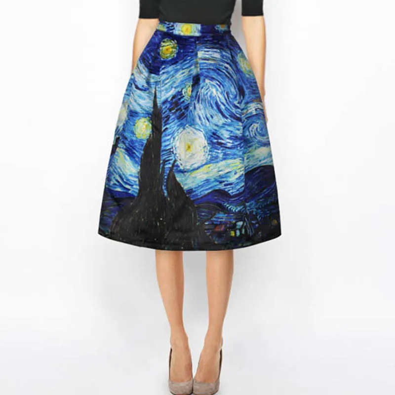 NORMOV Винтаж бальное платье юбка женская мода Высокая талия миди юбки Живопись Ван Гога облака печати Макси Femme Saias
