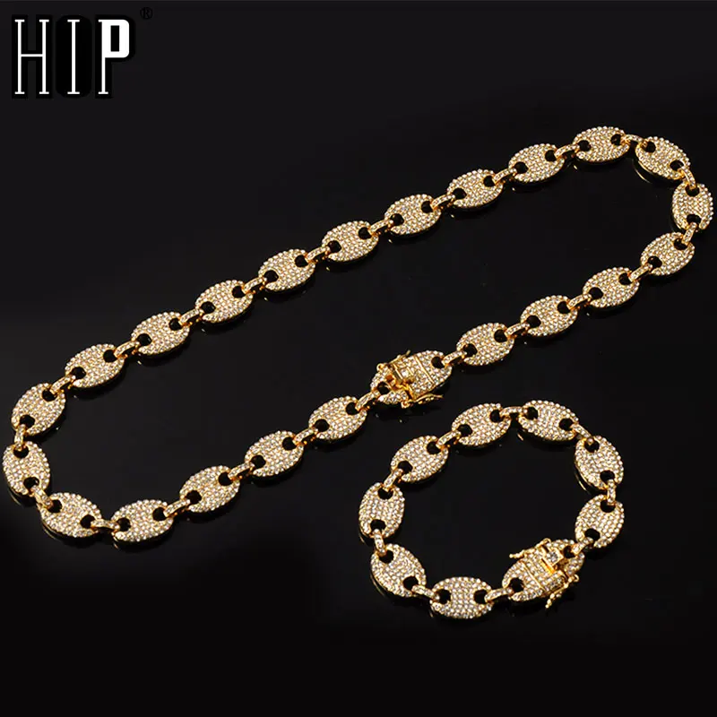 Хип-хоп 1kit Bling Многоцветный кофейные бобы Iced Out CZ Свинья Нос Стразы Шарм звено цепи ожерелья и браслет для мужчин ювелирные изделия