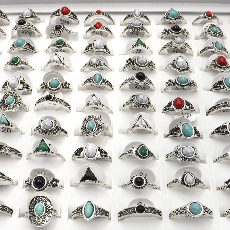 50 шт., античные серебряные кольца в винтажном стиле с разноцветными камнями для женщин