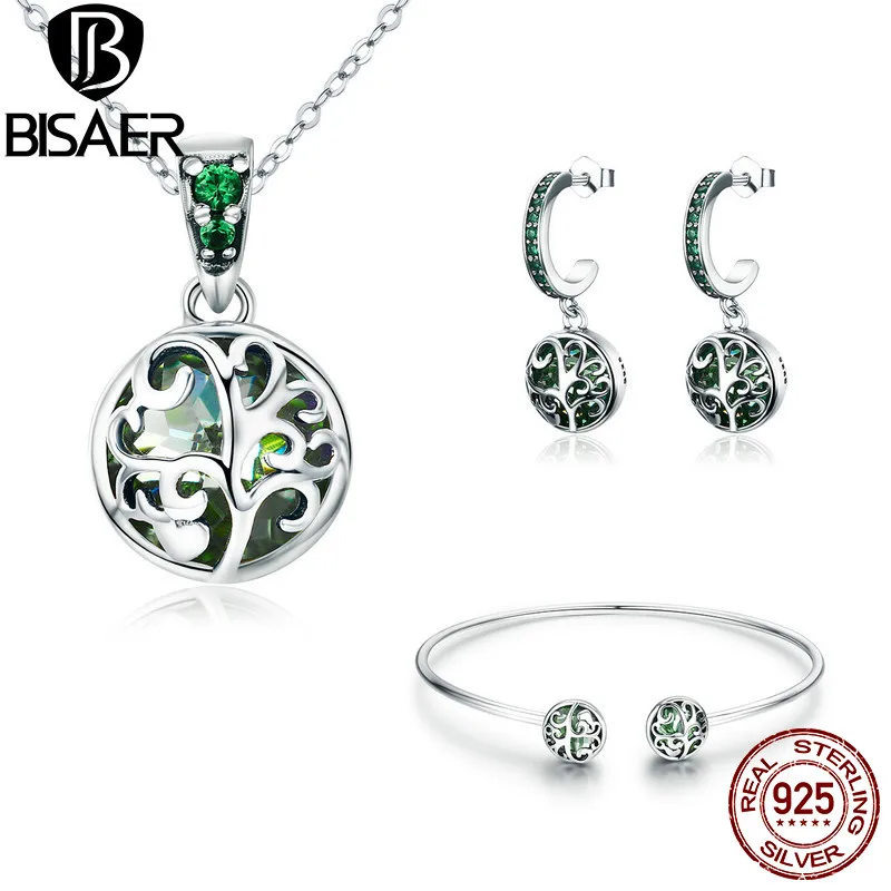 BISAER Серебряный Женский комплект ювелирных изделий 925 пробы серебро растение дерево Листья Лист Браслет Ожерелье Ювелирные наборы Модный ко...