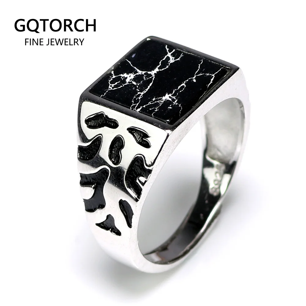 925 пробы серебро Винтаж Мужские кольца Регулируемый квадратной формы черный каменный цветок узор дизайн Мужской Турция ювелирные изделия