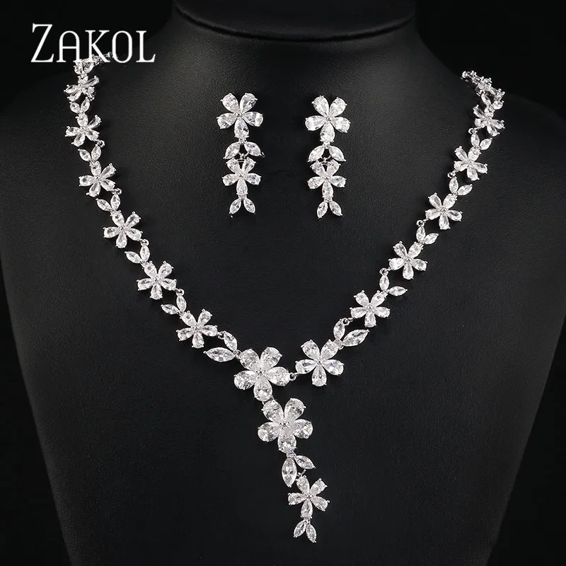 ZAKOL Роскошный белый цветок Форма полный Цирконий Дубай ювелирные наборы Для женщин свадебное платье невесты Аксессуары FSSP054