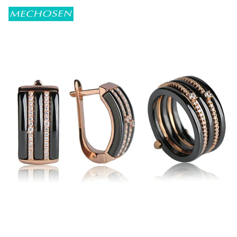 Набор ювелирных изделий из фарфора MECHOSEN, серьги и кольца, черные керамические стразы, 5 линий, круглые медные кольца с коробкой
