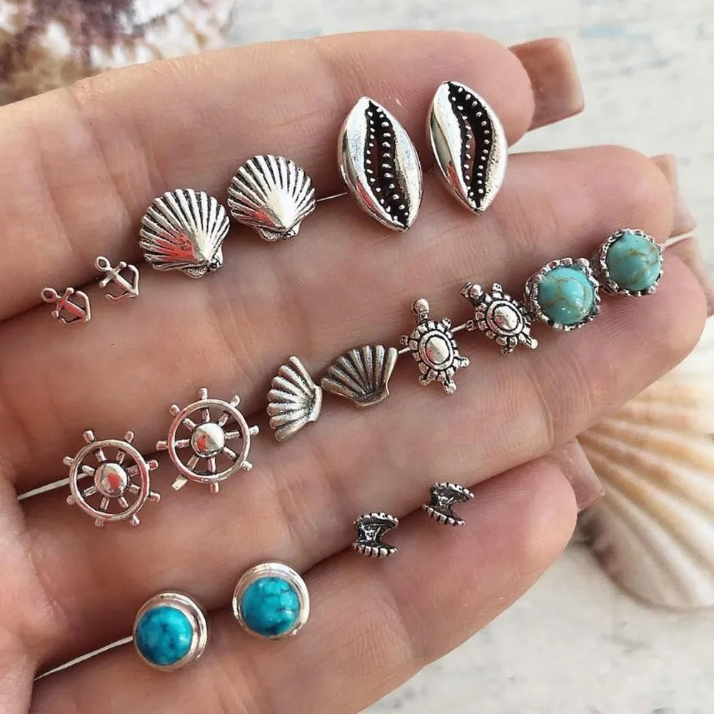 16 видов стилей Бохо панцирь черепахи якорь маленькая серьга Комплект сережек для женщин в стиле панк смешанный дизайн геометрический камен...