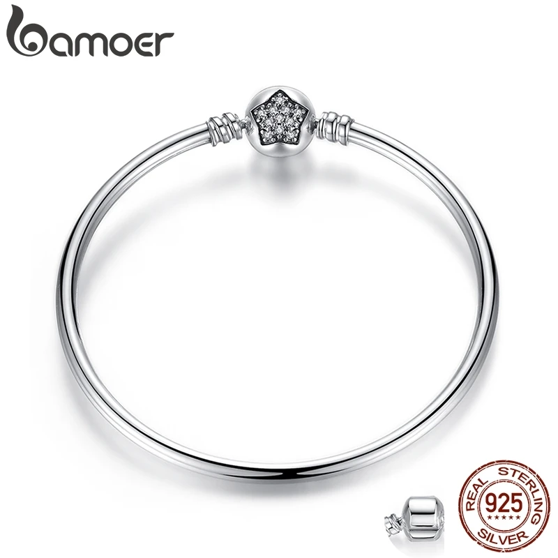 BAMOER Authentic 100% 925 Sterling Silver Snake Chain Bangle & Bracelet Pave Star Cubic Zirconia CZ Jewelry PAB001