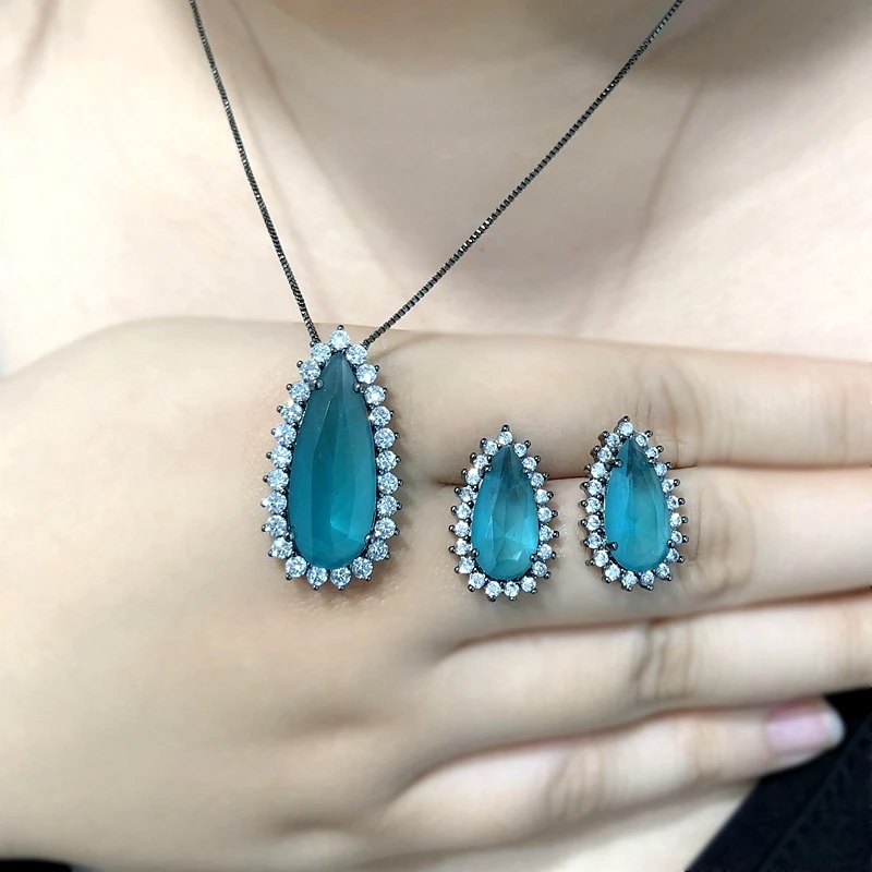 Роскошные Ювелирные наборы из Кубического циркония для женщин, кулон в виде капли воды, черная цепочка, ожерелье, серьги-гвоздики, набор, Свадебные ювелирные изделия CZ