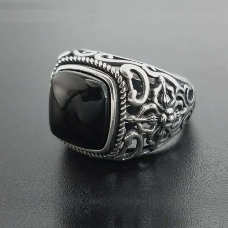 Настоящее серебро 925 Черный гранат S925 кольцо для мужчин и женщин Выгравированный цветок Мода Открытый Размер S925 кольцо стерлингового сереб...