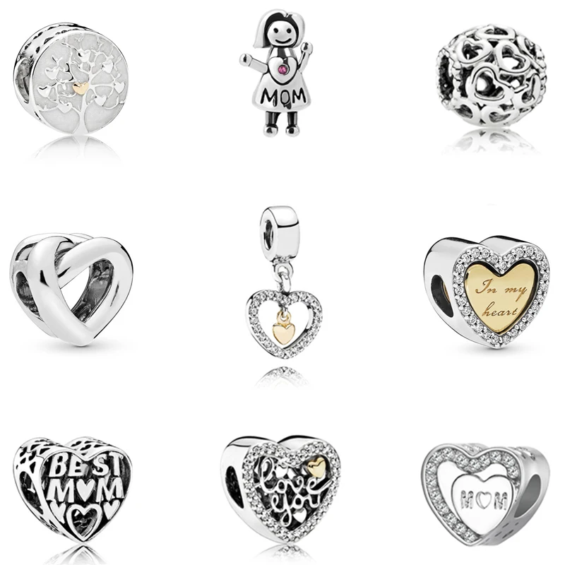 Посеребренные бусины в виде сердца для матери, ажурные кристаллы, семейный Шарм для мамы, оригинальные браслеты Pandora, сделай сам, Женские Ювелирные изделия для изготовления