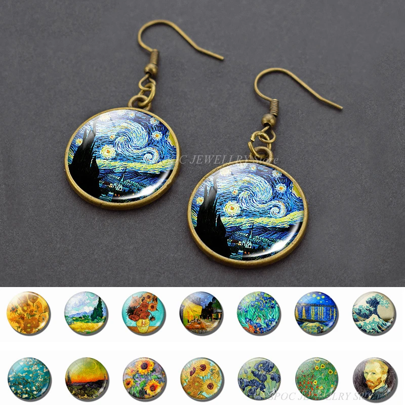 Серьги-пусеты Van Gogh, серьги-пусеты в виде звездной ночи для женщин и девушек, подарок, бижутерия со стеклянными кабошонами, бронзовые серьги, нежные ушные крючки