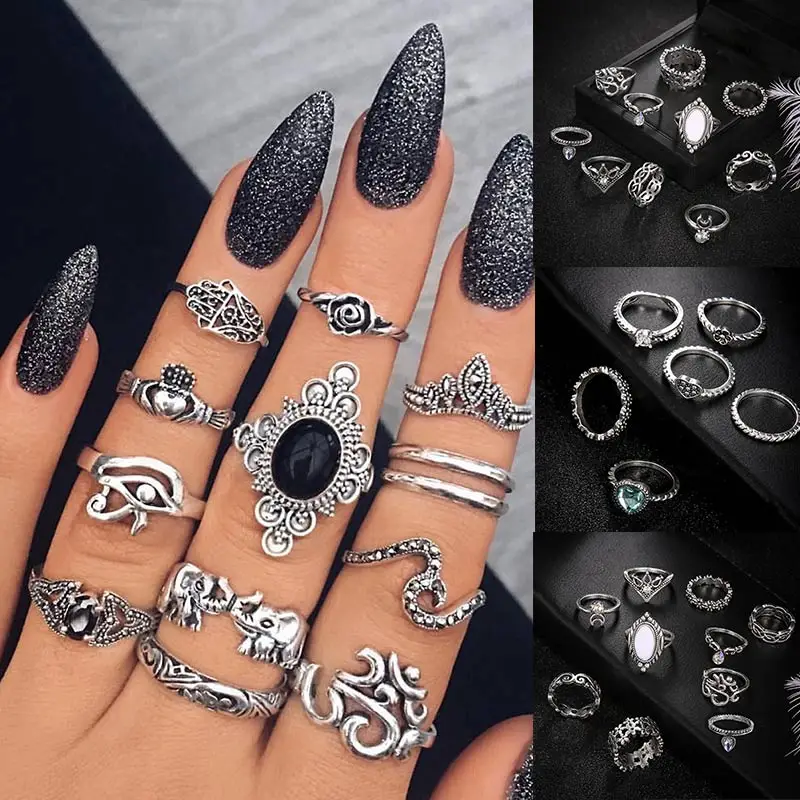 Набор колец в форме цветка, кольцо на кончик пальца, набор волн, 1 комплект, циркон, Золотое сердце, свадебные, сплав, серебро, Винтаж, на кончик пальца, вечерние ювелирные изделия, луна, кристалл