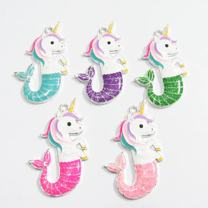 Новинка! 50 мм * 32 мм 10 шт./лот полностью эмалированные единорог с блестками хвост русалки кулон для массивных детей ожерелье