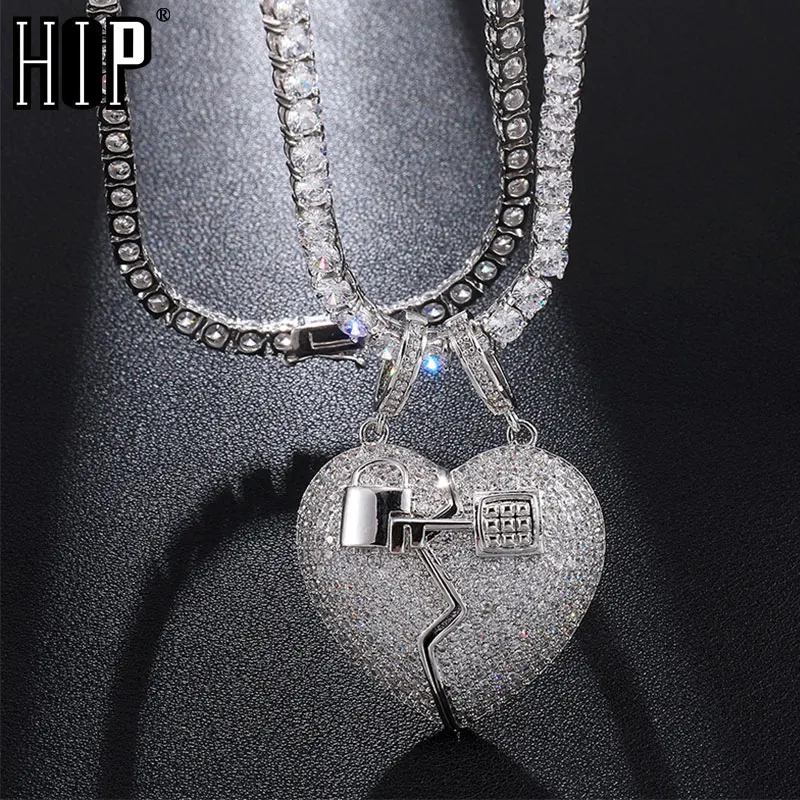 Хип-хоп Bling Iced Out с фианитами в микро-паве разделяемое разбитое сердце с ключом ожерелья и подвески для мужчин Rapper ювелирные изделия
