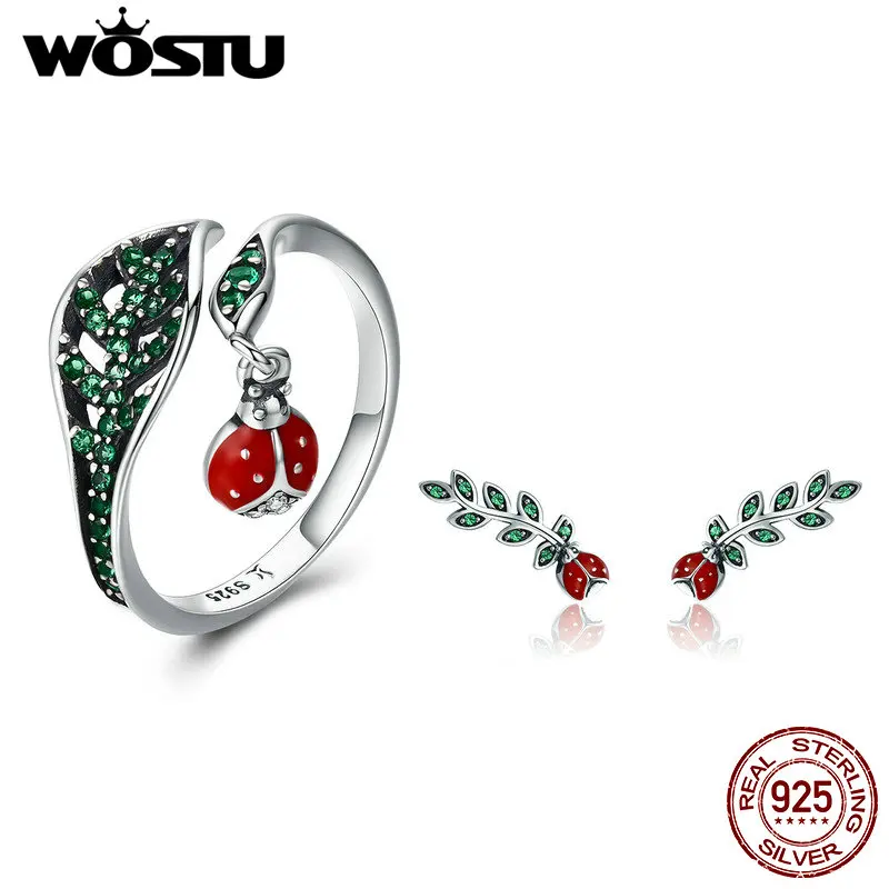 WOSTU Аутентичные 925 пробы серебро Высокое качество Зеленый CZ брошь из белого золота Красная божья коровка палец кольцо набор украшений для же...