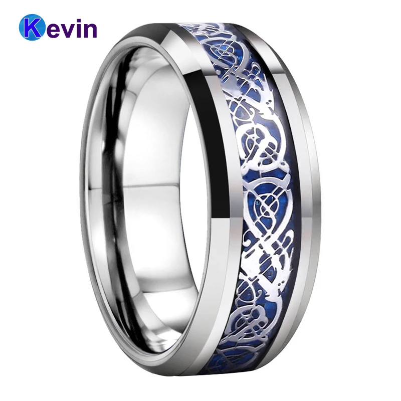 Мужская Свадебная лента, вольфрамовое свадебное кольцо с синим углеродным волокном и инкрустацией дракона, 8 мм, удобная посадка