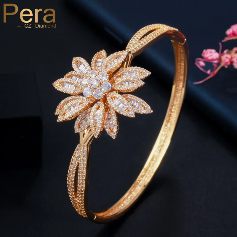 Pera высокое качество кубического циркония установка индийский стиль желтое золото 3D цветок круглый жесткий браслет для свадьбы для женщин ю...
