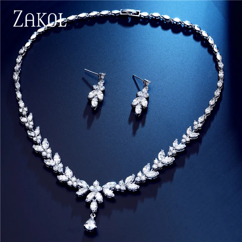 ZAKOL Простые Модные Листья Серьги серебристого цвета цепочки и ожерелья свадьбы Ювелирные наборы с AAA + CZ циркония FSSP180