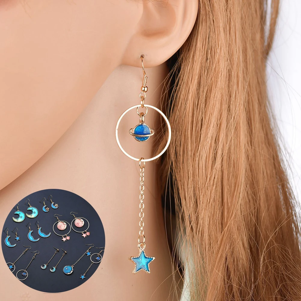 Женские модные розовые синие звезды луна длинные висячие серьги 2019 Элегантные Очаровательные Асимметричные круглые планеты яркие серьги у...
