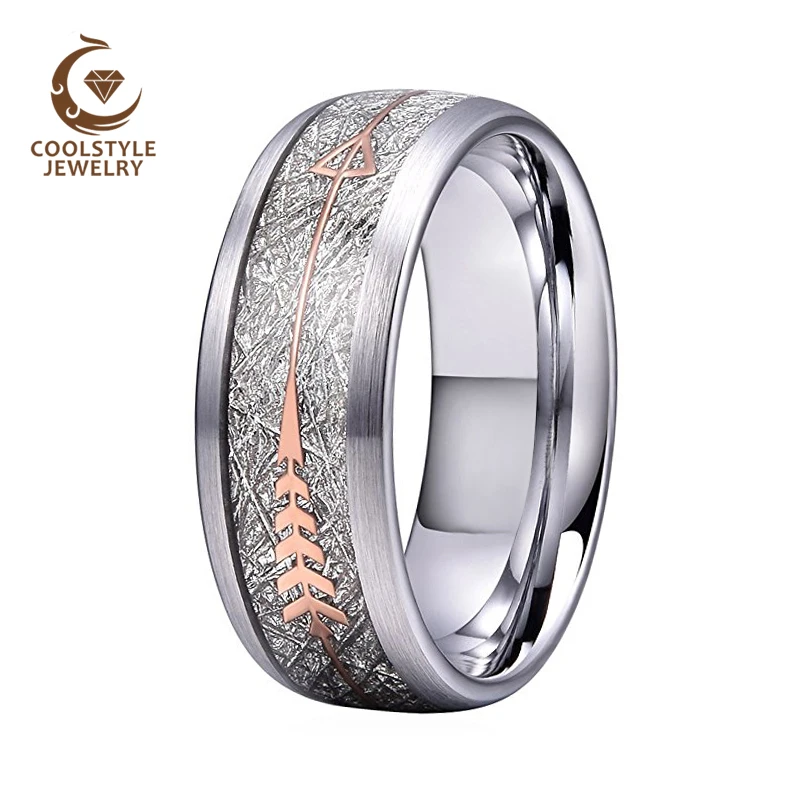 Мужская и женская Свадебная лента из карбида вольфрама с матовой отделкой с имитацией метеорита и инкрустацией стрелы из розового золота