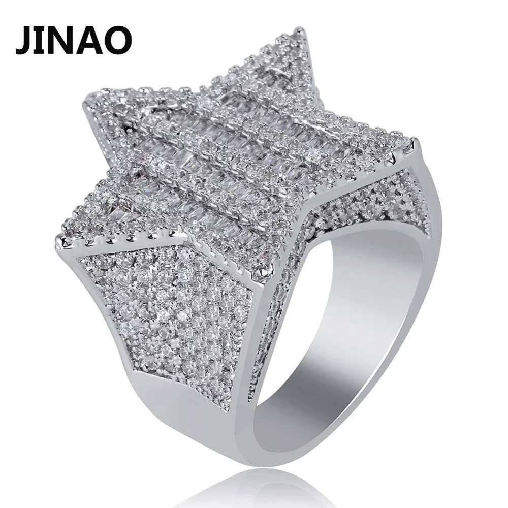 JINAO новый дизайн золотой серебряный цвет пятиконечные кольцо со звездами микро проложили Большой Циркон Блестящие хип-хоп палец кольцо для ...