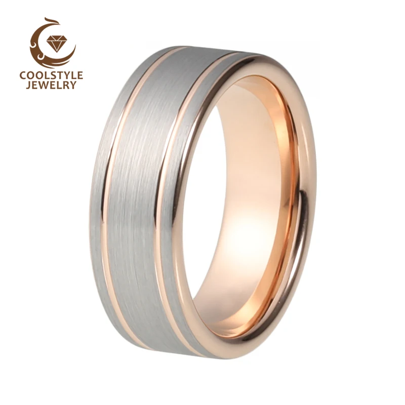 Вольфрам карбида Для мужчин кольцо 8 мм серебристый матовый топ розового золота Цвет PLAED двойной линии обручальное