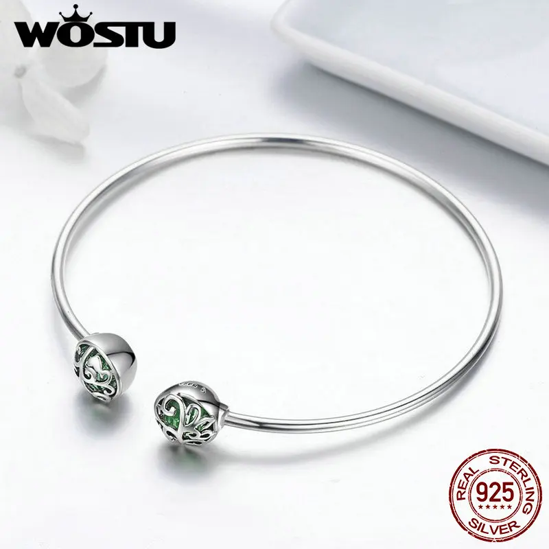 WOSTY натуральная 925 пробы серебро Высокое качество Зеленый фианит Древо жизни Открытый браслет для женщин Jonc Jewelry BKB057