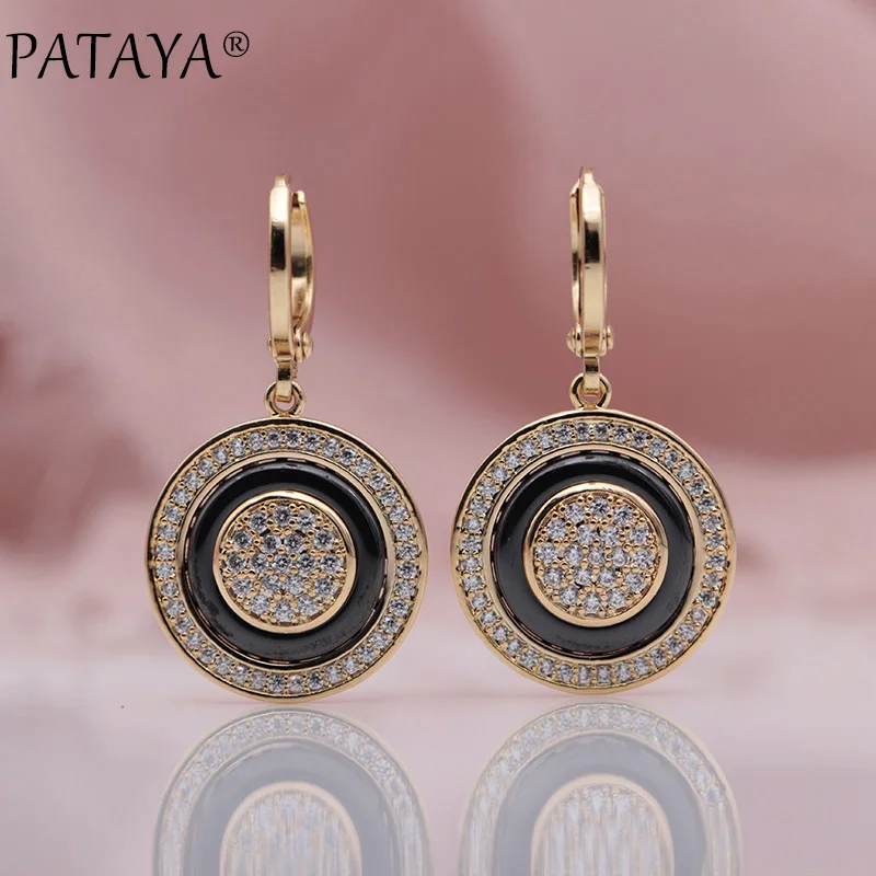 Женские круглые серьги PATAYA, черные керамические длинные серьги с микро-воском из натурального циркония, розовое золото 585 пробы, изящные украшения для свадьбы