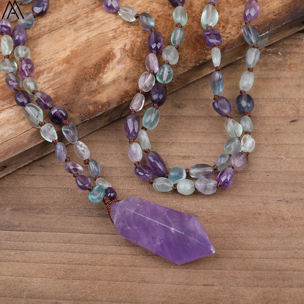 Двухточечный натуральный аметист кварц кулон Радуга Флюорит камень бусины ручной работы узел ожерелье длинные 32 дюймов N0261AMCD