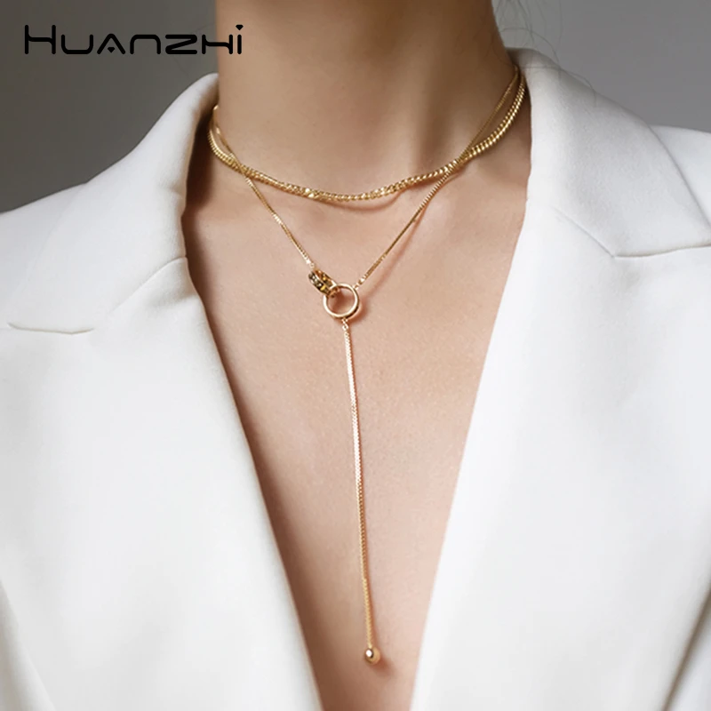 HUANZHI, Корея, Винтаж, золото, серебро, цвет, два слоя, круглые ожерелья, ключица, Геометрическая подвеска, цепь для женщин, ювелирные изделия, подарки
