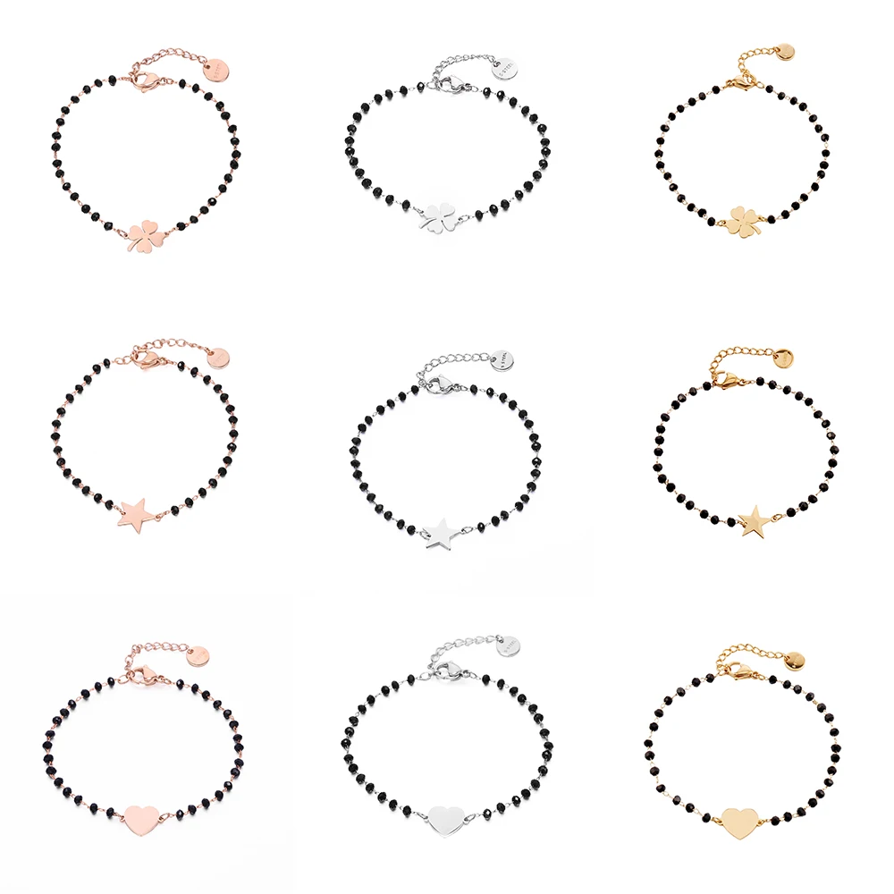 Женский браслет-цепочка из нержавеющей стали с черными хрустальными бусинами, розовое золото, сердце, звезда, четыре клевера, 2019